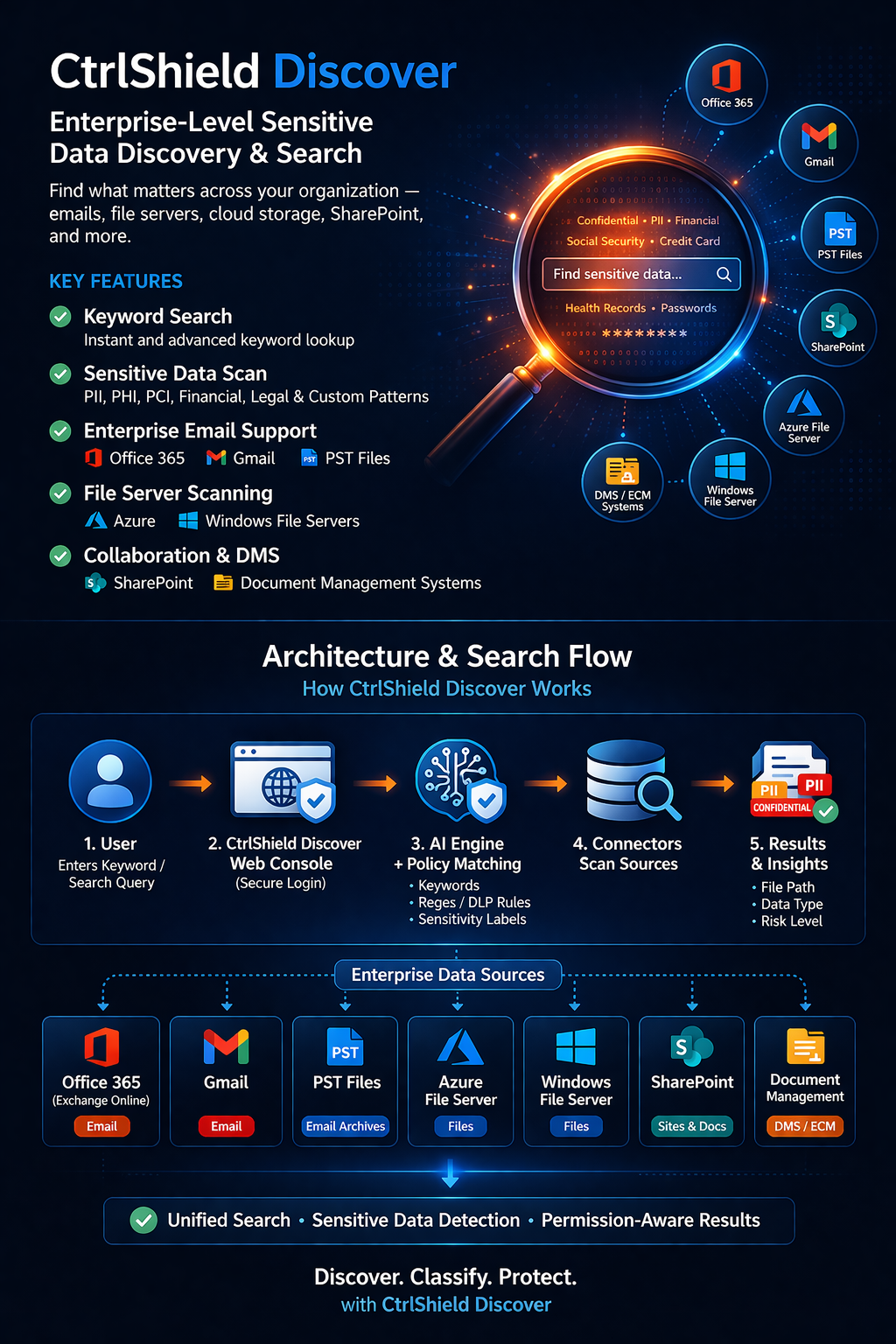 CtrlShield Discover scans emails, file servers, cloud storage, and document systems — exposing hidden PII, confidential files, and compliance risks before they become breaches.